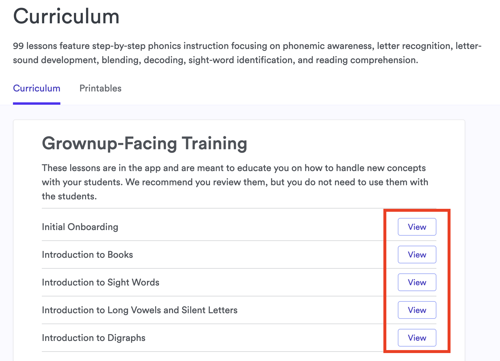 Our Grownup Training series offers valuable insights into handling new concepts with your students. While not mandatory, we highly recommend reviewing these lessons before introducing new concepts in your classroom to better understand how those concepts are introduced in the app itself. Simply click on the "View" button next to the concept you'd like to review. Completing the initial onboarding topic sets a strong foundation for success in utilizing Reading.com in your classroom.